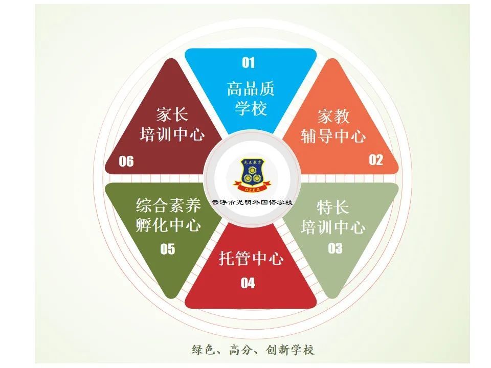 作为一所立足未来的“六合一功能”绿色高分创新学校,云浮市光明外国语学校集高品质学校、家教辅导中心、托管中心、特长培训中心、综合素质孵化中心、家长培训中心于一体,依托强大的集团实力支撑,致力于成为云浮一流、广东领先、全国知名的国际化基础教育示范基地。