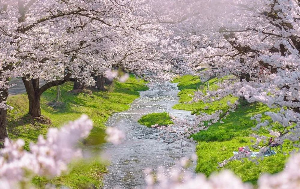 7.花筏(はないかだ):樱花花瓣洒落水面像竹筏一样漂浮,满满地铺在水面。