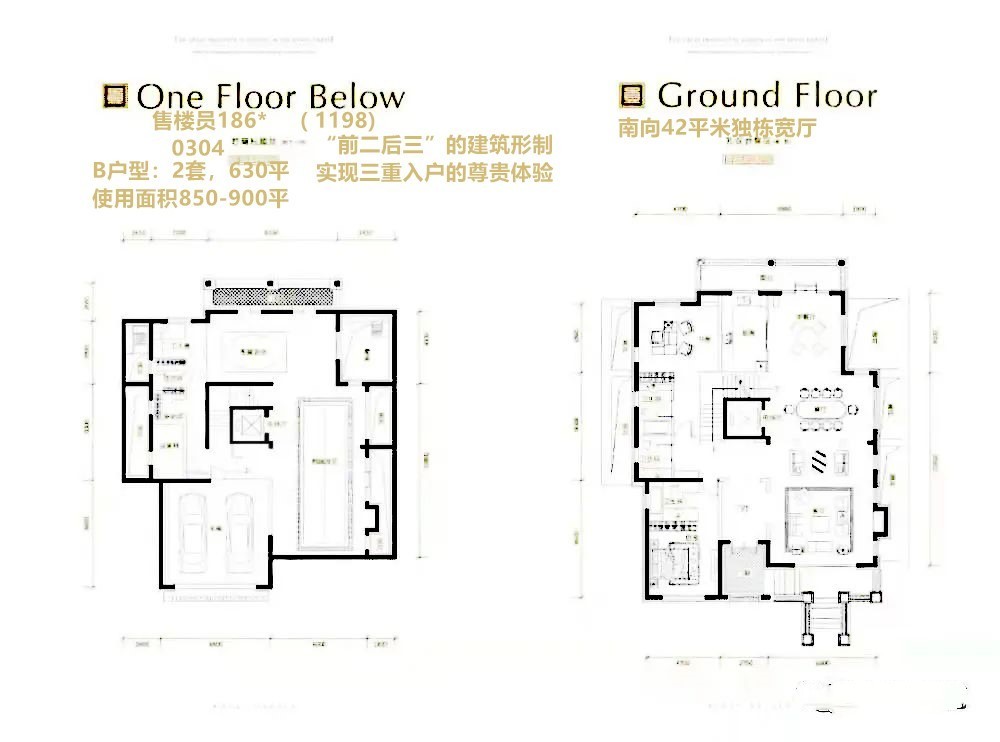 ②B户型:建面约600-650㎡,使用900-950㎡,