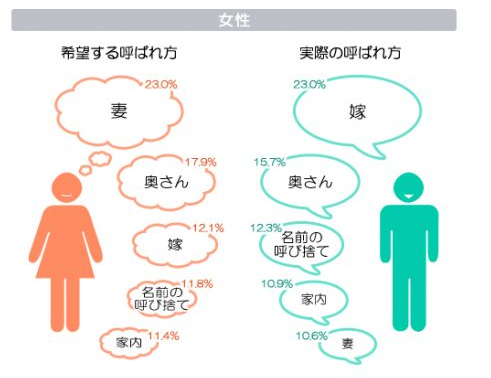 请看,这张图的左侧是女性希望丈夫在别人面前提及自己时的称呼,右侧则是丈夫对妻子们实际的称呼...