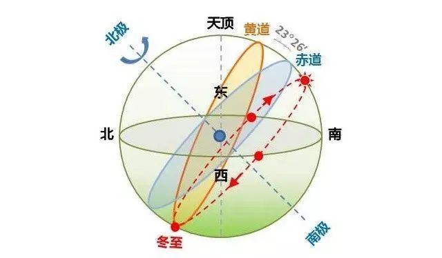 “由于地球公转轨道面和自转轨道面之间交角的存在,一年中太阳光直射地球的落点在北回归线和南回归线构成的界限内周期往复,形成寒来暑往、四季更迭。地球上看,太阳是在黄道上运行。当太阳到达黄经270度时,冬至节气开始。”成灼说。