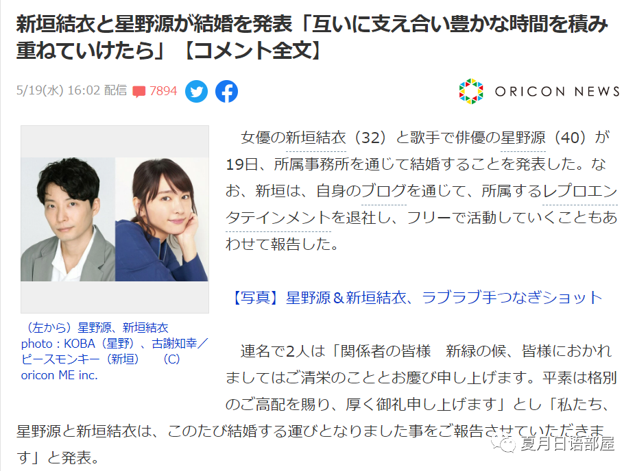 你们的老婆要结婚了?!新垣结衣与星野源宣布结婚!