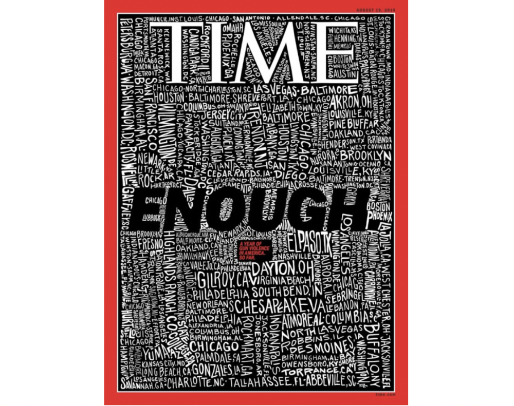 枪击案的封面,用相同的风格设计‘Enough’,然后再用拼拼图的方式把其他元素填进去。”