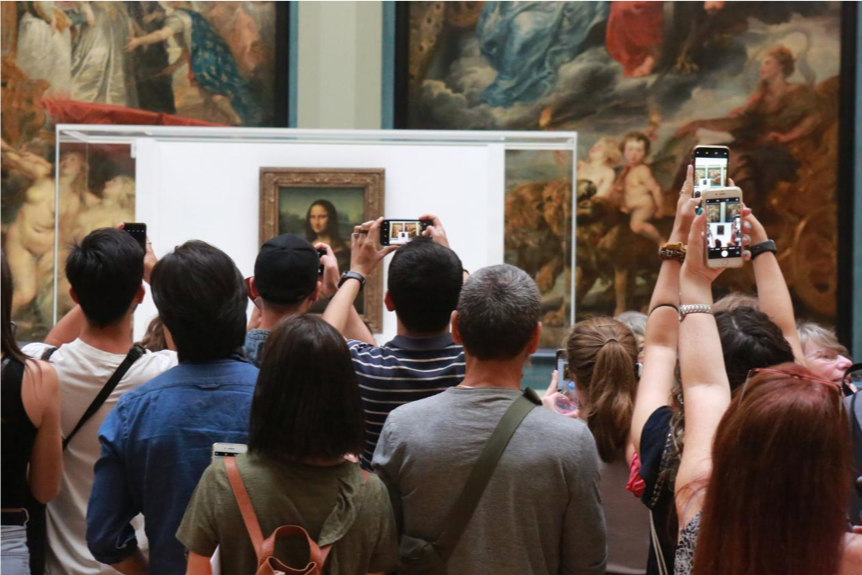 参观的时间太短,或许可以透过拍照来解决,但那也成为问题的一部分。许多人不只想看蒙娜丽莎,还想跟名画合照,把照片放上社交媒体证明到此一游。还有许多人根本不看画,只专注于自己智慧手机的镜头,甚至有人背对这幅名画,摆出自己最佳的蒙娜丽莎微笑自拍。19岁的科威特大学生Alia Al Jabr.表示,她不在乎拥挤,因为她拍到了一张美照,还拍了一段影音。她说若没拍照,“我会很难过”,“我们得拍照,记得自己首度来此一游。”