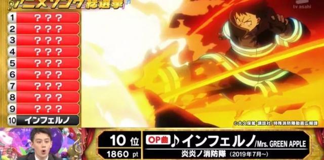 排在第十名的是动画《炎炎消防队》的OP「インフェルノ」,这部动画也是近几年来人气较火的动画之一,别看作品的名字叫做“消防队”,但其实它还是日本典型的热血少年番,剧情也非常好看,有兴趣的同学们可以关注一下。
