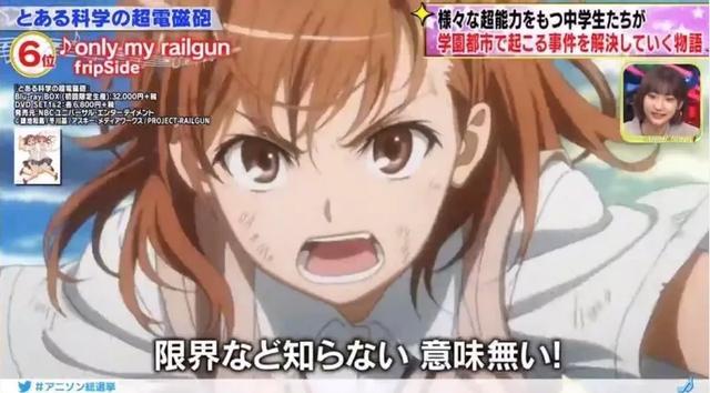 《某科学的超电磁炮》第一季的OP「only my railgun」在这次总决赛中排到了第六名,成绩非常不错。而「only my railgun」这首歌也是一首影响力很大的歌,特别是南条爱乃的版本。