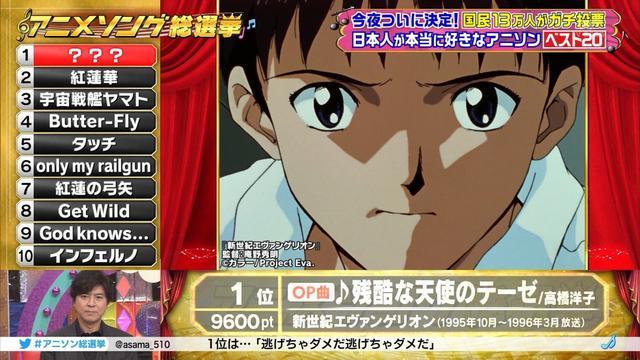 排在第一名的则是经典动画《新世纪福音战士》的主题曲「残酷な天使のテーゼ」,这首歌在日本作为卡拉OK的必点曲目曾经占据排行榜冠军长达19年,而它取得这次总决选的冠军也是实至名归,对此,我只能说一句“EVA,永远滴神!”。