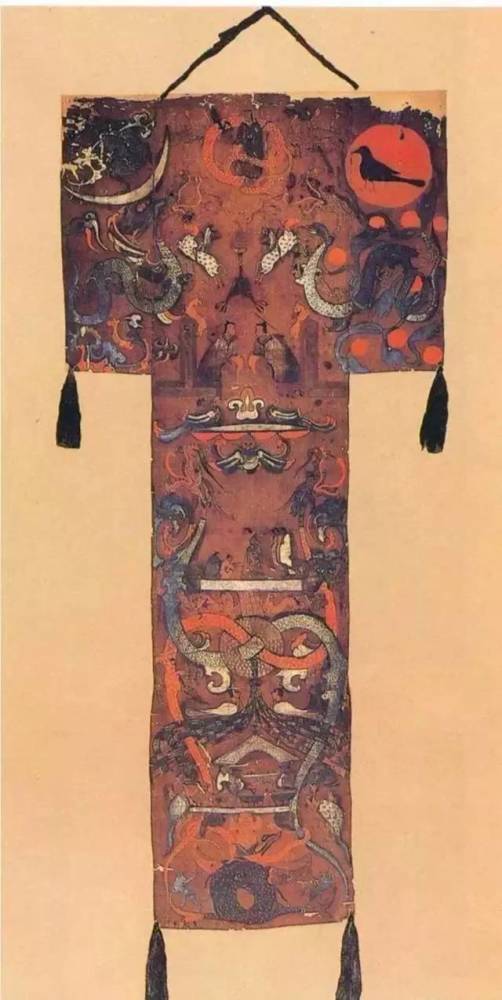 此帛画是长沙国丞相之妻死后的随品。画分为三部分:上部以祈颂墓主人升天为主题;中部则表现墓主人日常生活;下部绘两条交缠的鲲,背上蹲着一个赤身力士。