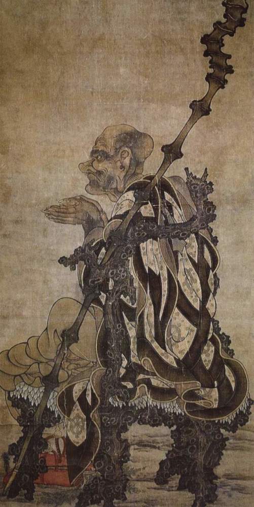 画中罗汉为诺距罗尊者,原是一名勇猛的战士。后来出家,佛祖让他静坐修行,以摒弃当兵时的粗野性格。后虽修成罗汉,但他静坐时仍有一股威猛之气。