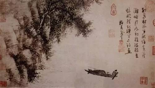 该图表现的是江南的秀色和渔民生活。江边高树坡石,其上远山层叠,江中渔舟有停泊,一幅秀润美丽的江山渔乐图卷。