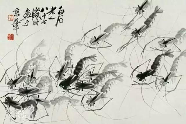 此作是齐白石晚年期间所创作的一幅画,藏于上海博物馆。在表现了水墨、宣纸的独物性能外,又将虾之质感表现的淋漓尽致, 是白石笔下最写实的对象之一。