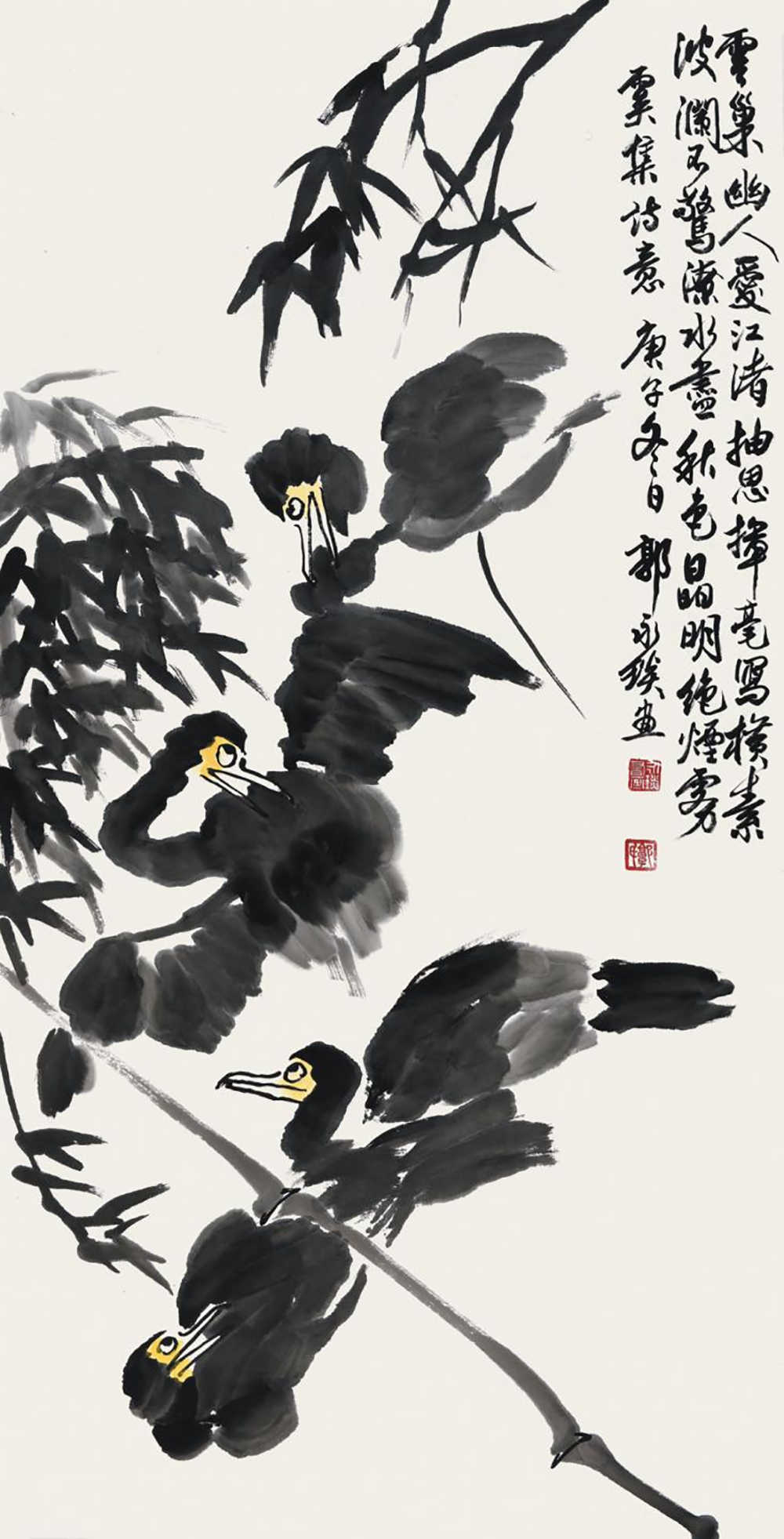 学习先辈画风,最难于诗书画的全面继承,缺一不可,否则徒取其形,失其内在。其次,还得上溯前代诸名家,探之渊源,否则一昧仿效,必走向习气。当代大写意花鸟画家郭永琰即是一位具有全面艺术修养,于“诗、书、画”于一身艺术家,他生于著名编钟之乡湖北随州,小学三年级开始画画,如醉如痴。1978年,他参军入伍到北京中央首脑驻地当警卫战士,中南海的楼台匾额、楹联碑刻,矄陶了他的艺术灵性。1984年,他先后拜李苦禅大师入室弟子、著名画家邓锡良先生和著名书法家康雍先生为师,远学宋元花鸟的严谨笔法,近学明清诸家恣意豪放之神韵。面对一幅幅传世之作,他心摹手追,废寝忘餐,研精钩深,穷幽极微,全面继承前辈大家名宿的诗书画艺术,既追探前人的成功之路,更学他们把“心、情、意、志、魄”熔于一炉的艺术创作境界,在大写意花鸟领地向艺术山岭高峰攀登。