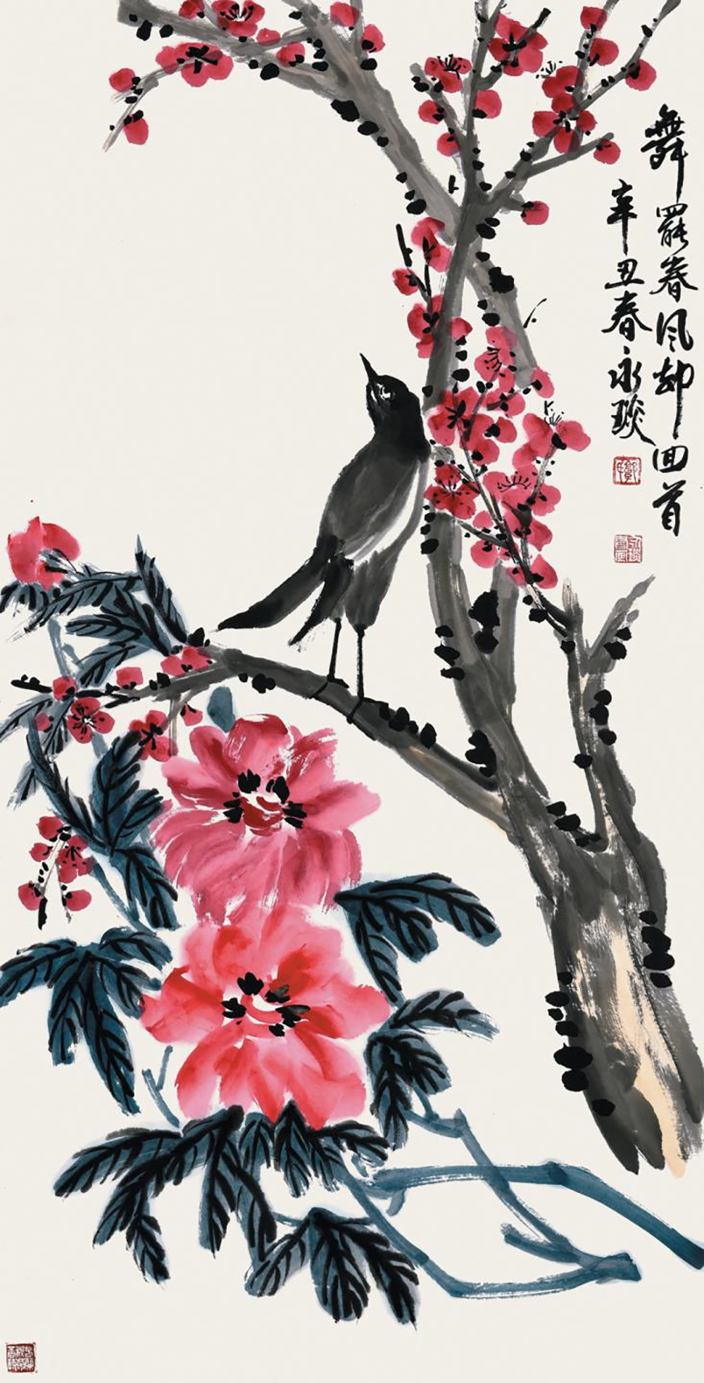 题曰:舞罢春风却回首。辛丑春,永琰。《郭氏》朱文,《永琰书画》白文,《花香深处》白文。