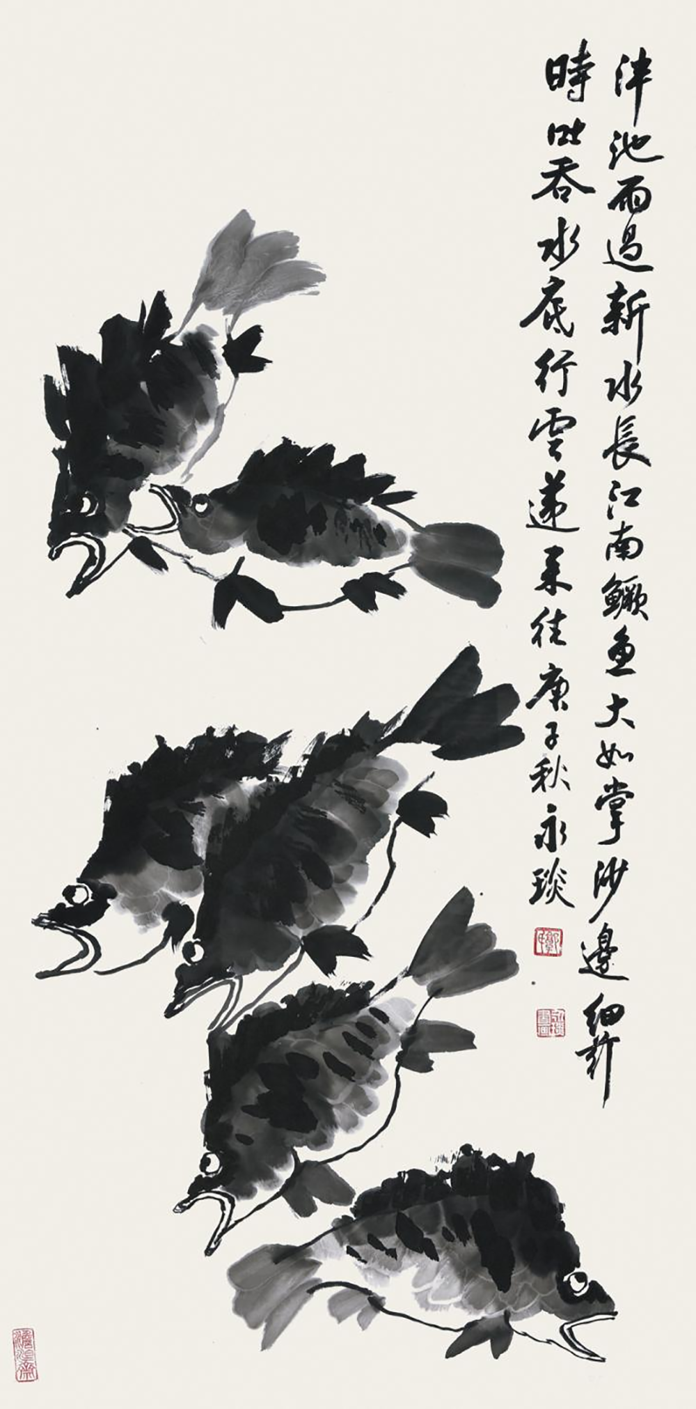 题曰:泮池雨过新水长,江南鳜鱼大于掌,沙边细荇时呑吐,水底行云递来往。(明李东阳诗句)我有胸中十万杆子,一时飞作淋漓墨。庚子秋永琰。《郭氏》朱文,《郭永琰》白文。