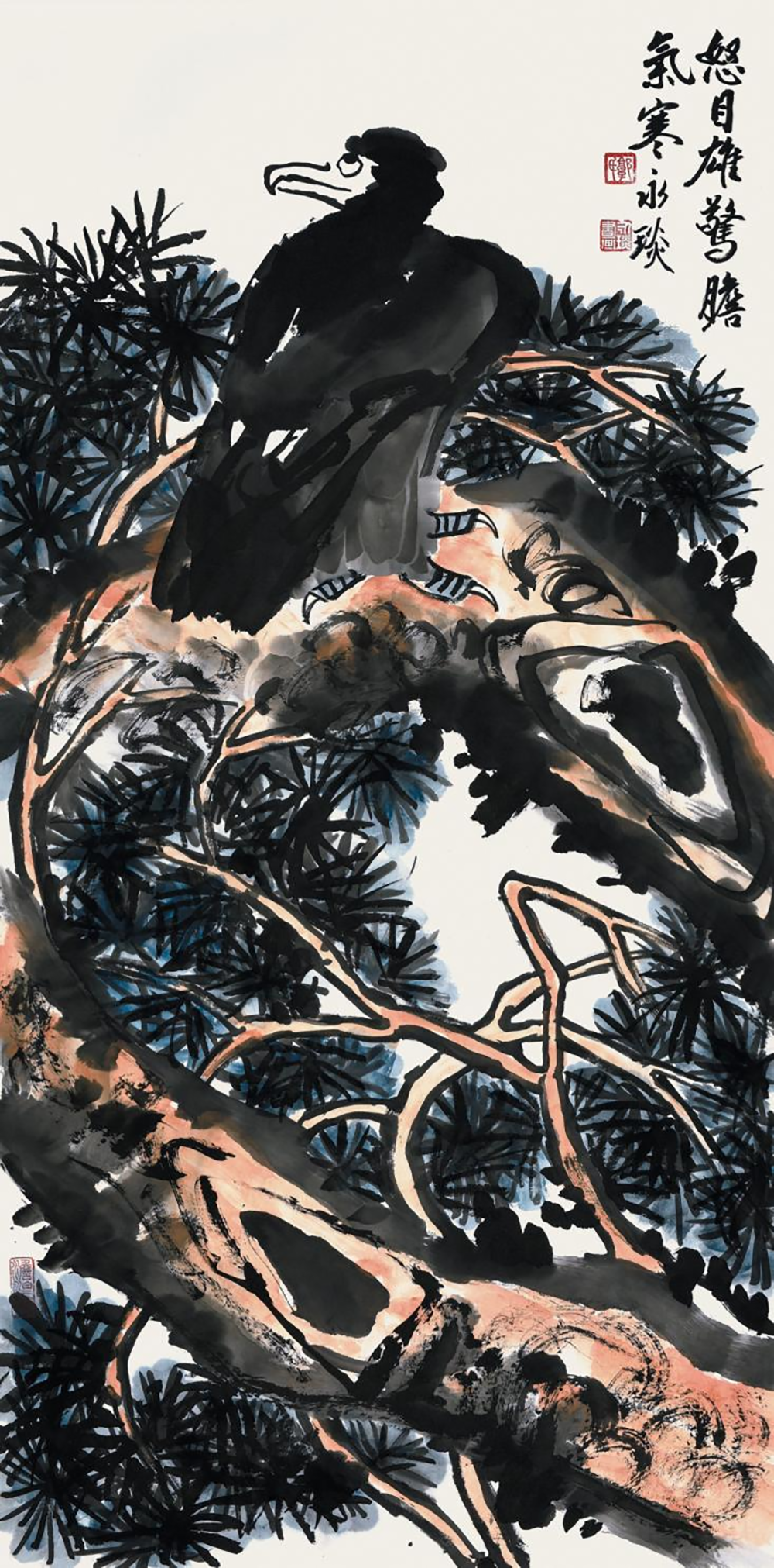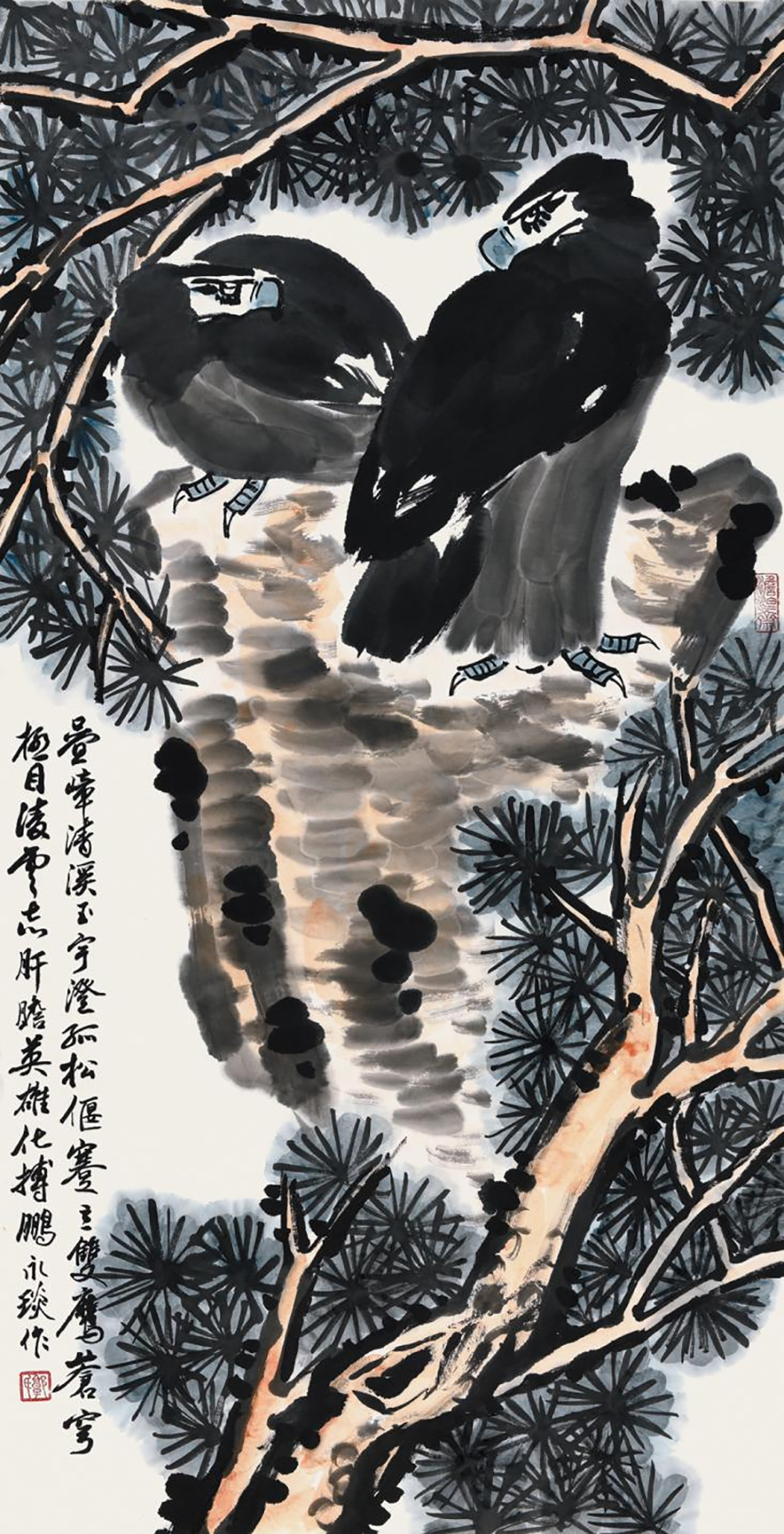 题曰:叠嶂清溪玉宇澄,孤松偃蹇立双鹰。苍穹极目凌云志,肝胆英雄化搏鹏。永琰作。《郭氏》朱文,《淡泊斋》朱文。