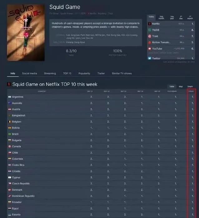 如果要问这部影片目前到底有多火?从9月17日起一开播便一炮走红。夺下Netflix美国榜冠军。在世界各地的播放榜当中也排名第一,包括印度、澳大利亚、爱沙尼亚、巴西等190多个国家。