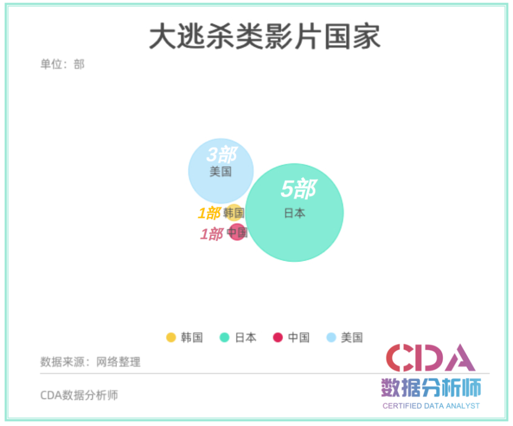 通过分析可以发现,日本盛产大逃杀类型的影片。在我们列举的十部代表性作品中就有5部来自日本,妥妥占据半壁江山。美国也《饥饿游戏》《移动迷宫》《密室逃脱》有3部作品。代表作品中,韩国、中国各占一部。