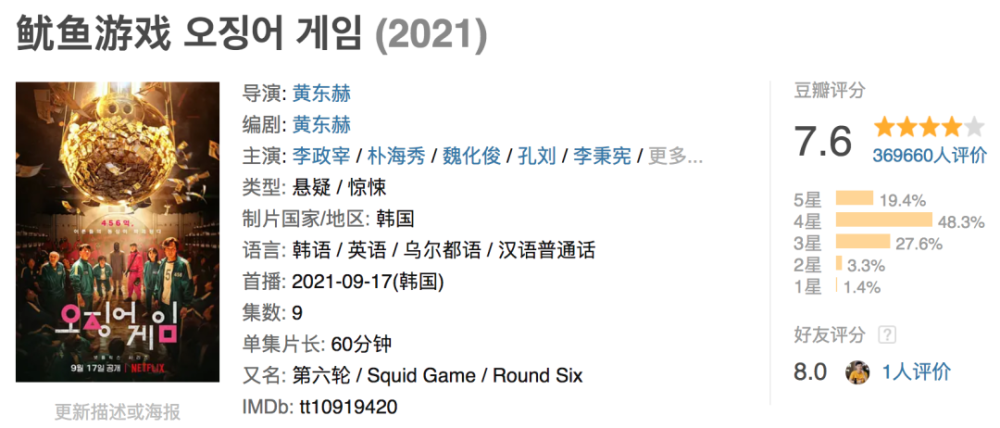 目前《鱿鱼游戏》在豆瓣为7.6分,已经有36万余人进行了评价,可见热度之高。