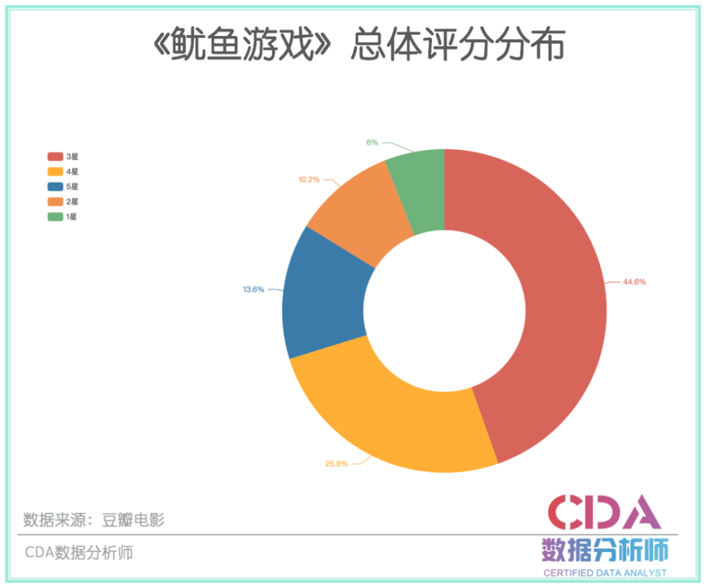 我们进一步用Python分析了这些评论数据,可以发现有13.6%的人给出了5星,25.6%的给出了4星,其次有44.6%的给出了3星。