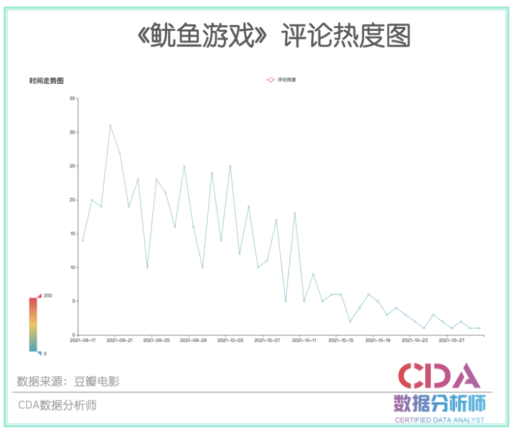 从评论热度图可以看到,在一开播《鱿鱼游戏》就引发了热议。之后随着热度的累积,讨论度持续不断。