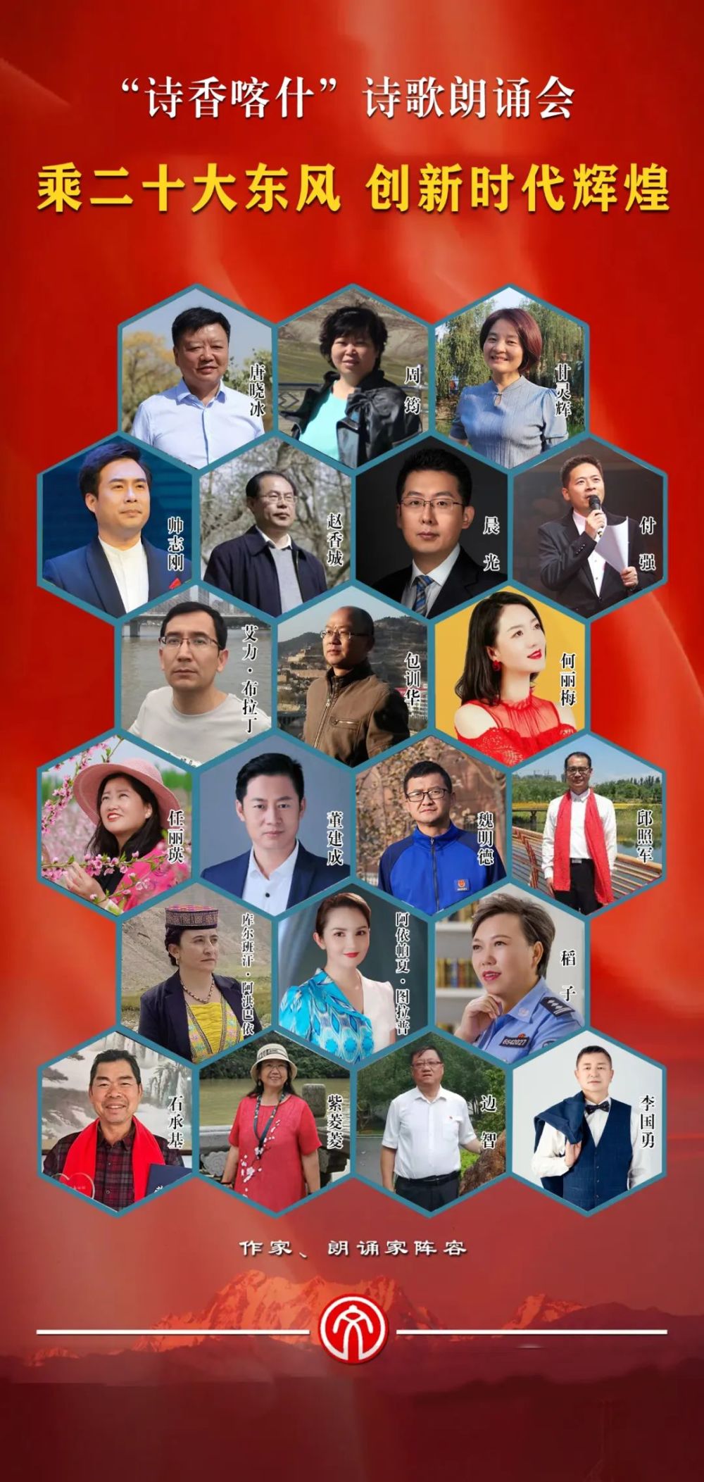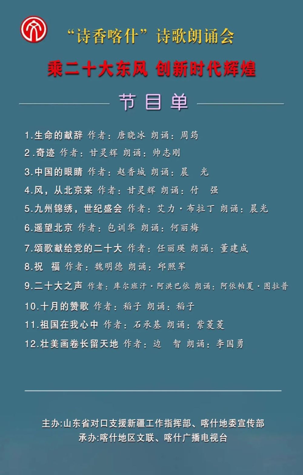 为庆祝党的二十大胜利召开,山东省对口支援新疆工作指挥部、喀什地委宣传部主办,喀什地区文联与喀什广播电视台联合承办的《“乘二十大东风 创新时代辉煌——“诗香喀什”音乐诗歌朗诵会》今天正式发布。朗诵会收录了十二位喀什作家、诗人的诗歌,集中歌颂了新时代新成就,吟咏了新喀什新气象。来自广东、上海著名朗诵艺术家及喀什本地的著名播音员、诵读爱好者等参与了此次朗诵活动。让我们牢记嘱托,踔厉前行,以崭新的姿态与昂扬的精神开创新时代新辉煌。