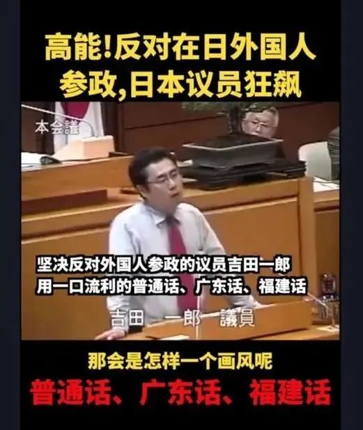 2010年6月3日日本琦玉市议会上,讨论到外国人参政问题的时候,议员吉田一郎站出来阐述了他的反对意见,过程中狂飙普通话、粤语、闽南语,生动形象,效果满满!