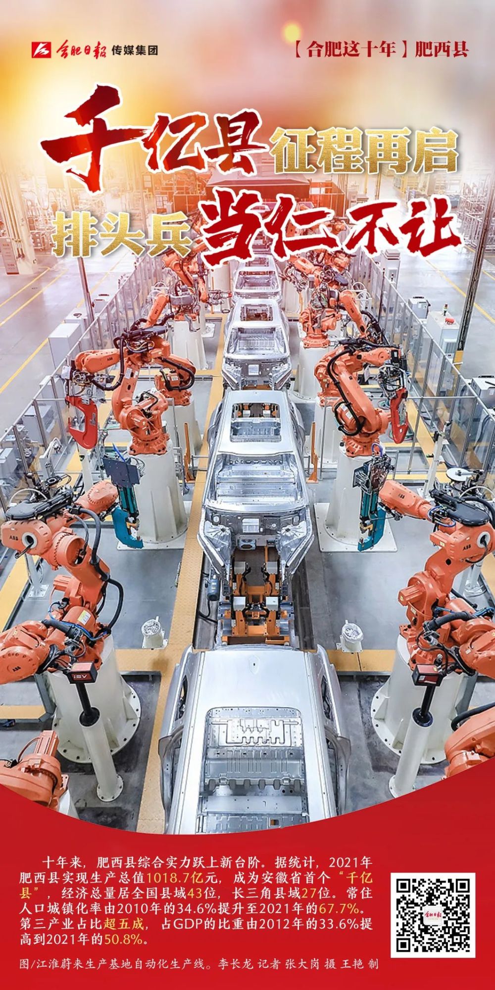 十年间,肥西县域综合实力稳步提升,百强持续进位,连续13年蝉联全国百强县,目前位居第46位,提升43个位次;经济总量连跨6个百亿台阶,2021年突破千亿,达1018.7亿元,成为安徽省首个“千亿县”。
