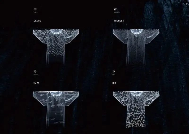 后来我又想做几种结合自然现象中的节气图案。以此来表达的是"日本的雨",而创造出一种湿润而强烈的视觉效果。