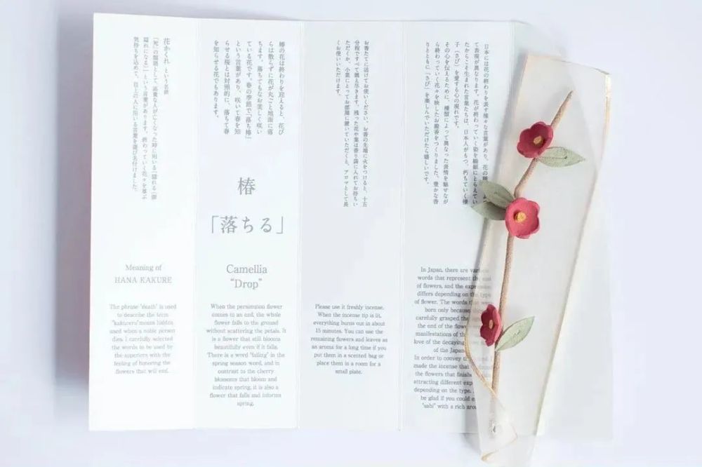 这个作品是我为"传达日本花香魅力"的创作项目。在日语中,花的衰败有很多说法,比如山茶花是"落",梅花是"洒"。