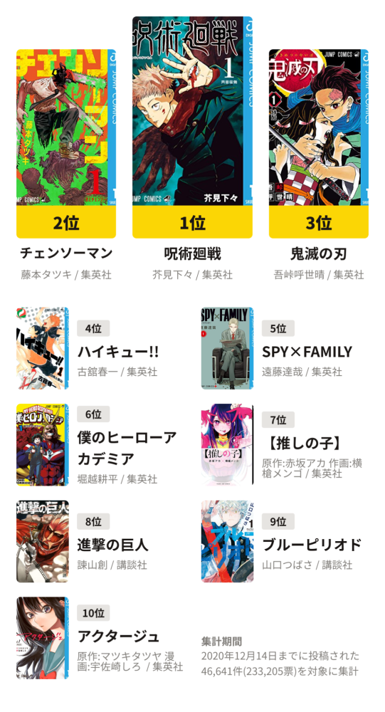 上周评选出的“这本漫画真厉害!2021”榜单想必大家都已经看过了,虽然榜单权威性很高,但是咱们也参与不进去也投不了票。而今天又有网站发起了关于“我的2020年漫画BEST5”的票选活动,这个#私の2020年マンガBEST5#tag发布的当天便登上了日推趋势第一名,这次活动邀请了共超过46,000推特用户参与,选票共计23万3205票,根据他们的选票选出了排行前50的漫画作品。