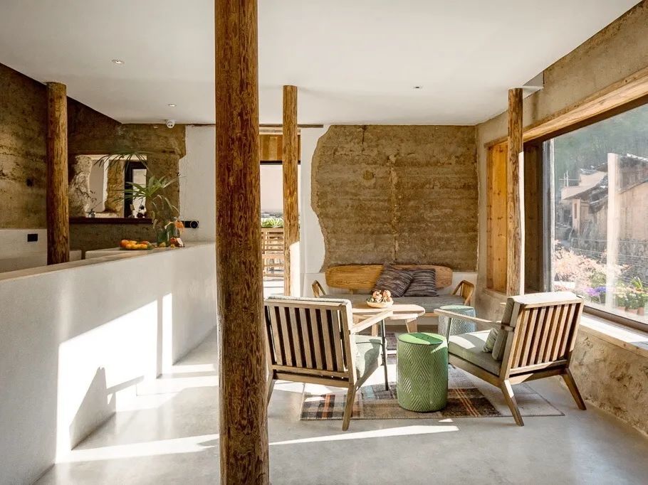 老旧的夯土墙,浸透着百年岁月的风韵,现代元素的加入,在古朴的厚重感里注入了一两分超脱之意。