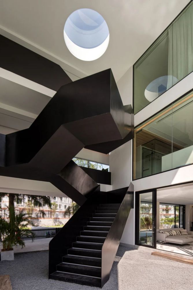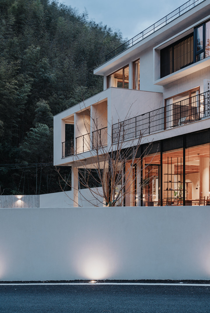 两座黑白呼应的交叉旋梯,成了民宿的点睛之笔。白色楼梯贴于建筑外部、黑色楼梯伫立于建筑之间,成为整个觅度·杉里的纽带。
