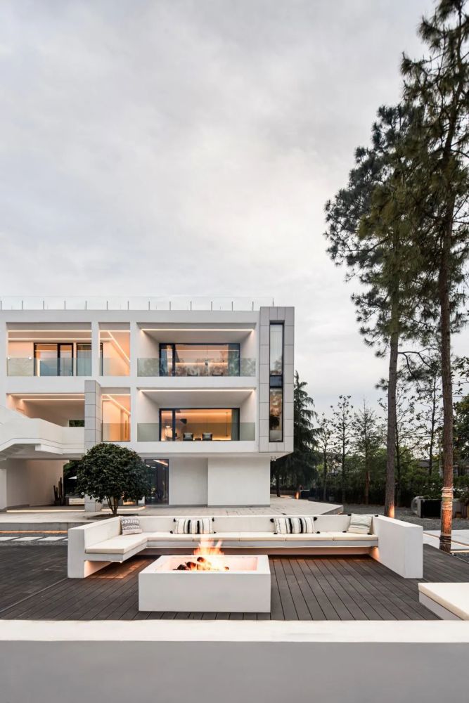 建筑通体白色,犹如一片洁白的云朵悬浮空中,杉树林直立于此,篝火区、小沙滩错落其间,超大公区超多玩乐。
