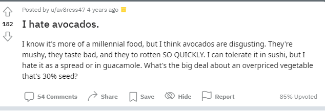 美国网友提问:“为什么会有人说牛油果好吃?”图片来源:reddit