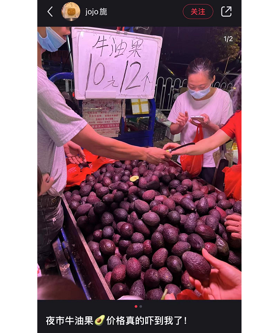 小红书网友拍摄到的关于“牛油果10元12个”的照片 图片来源:小红书