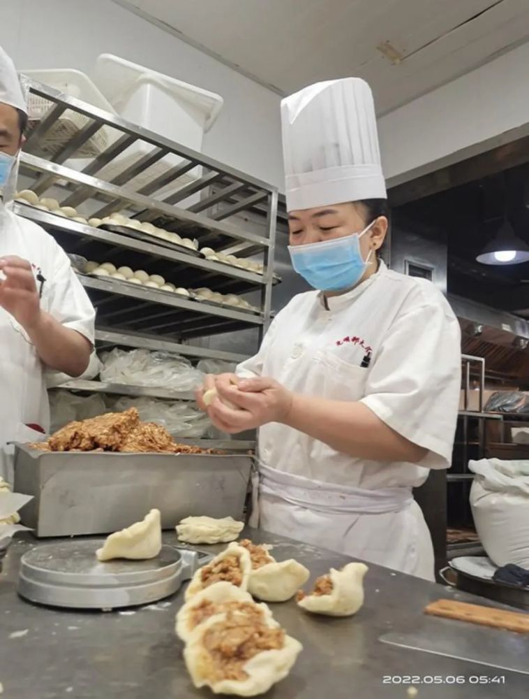 凌晨两点半,张红燕的手机闹钟响了。她从行军床上起身,快速洗漱,三点不到就走进了后厨,第一件事是打面。“椒盐饼、黑洋酥饼的面团是冷水发面,先把它们打出来醒发,再去打温水发面的月饼皮。”另一边的同事则拌起各种馅料,等到原材料准备完毕后,大家围在案板前,把鲜肉月饼、椒盐饼、豆沙青团、蛋黄肉松酥饼等点心一个个包出来。