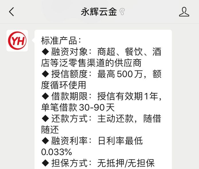 永辉云金公众号显示,“惠商超”为无抵押、无担保融资服务。额度最高为500万,可循环使用,授信有效期为1年,日利率最低为0.033%。