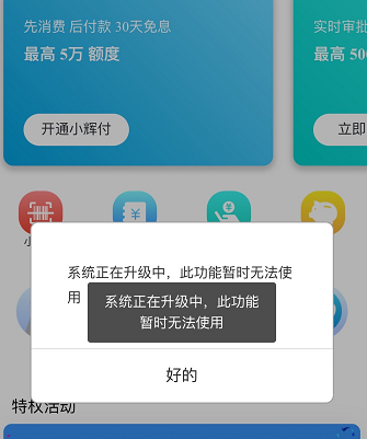 然而,瞭望消金尝试通过永辉金融APP开通小辉付,显示的却是“系统正在升级中,此功能暂时无法使用”。
