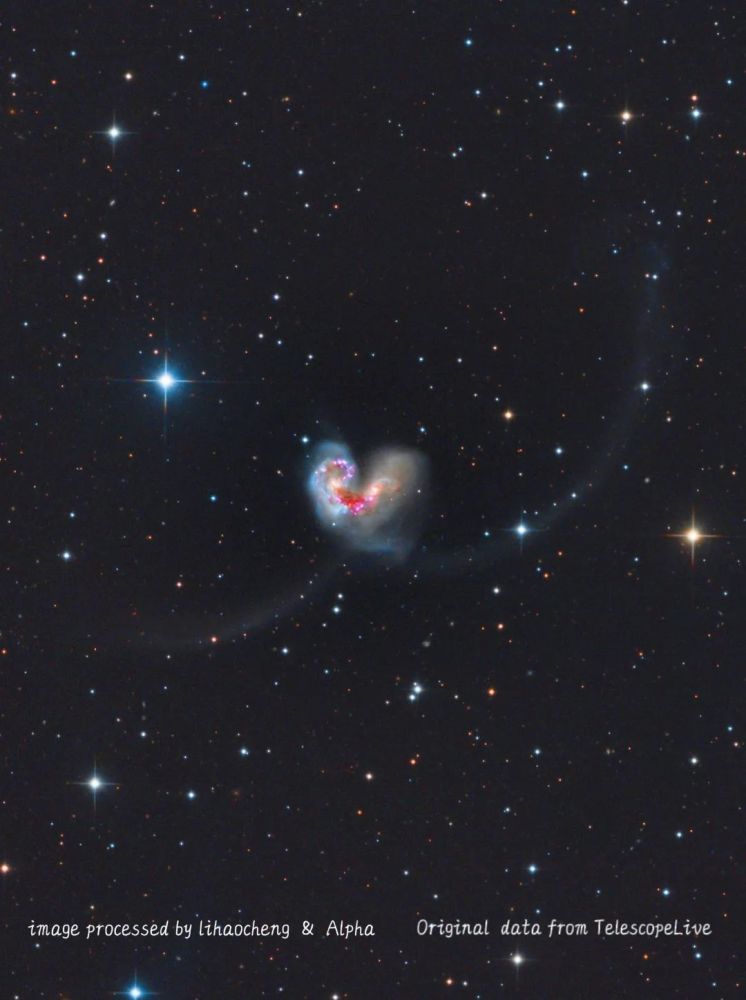 经历了数亿年的旅行 两个星系最终交织在一起 在夜空中形成了一条心形项链,这便是触须星系 。