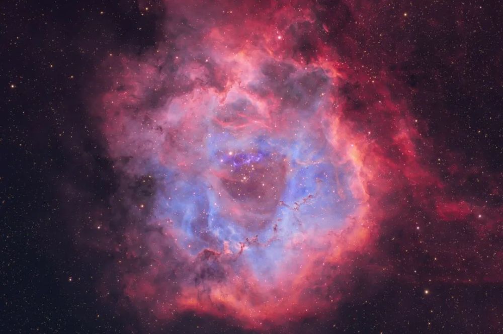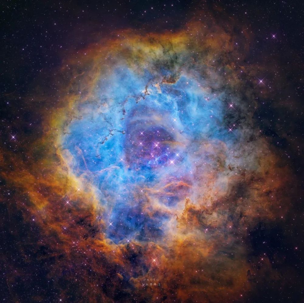 这一份浪漫来自宇宙深处,它绽放在麒麟座的一个庞大分子云末端,离我们5200光年左右,直径大约130光年,是的它就是大家熟知的玫瑰星云。这里通过窄带拍摄,让原本象征爱情的红色玫瑰变得更加多彩。