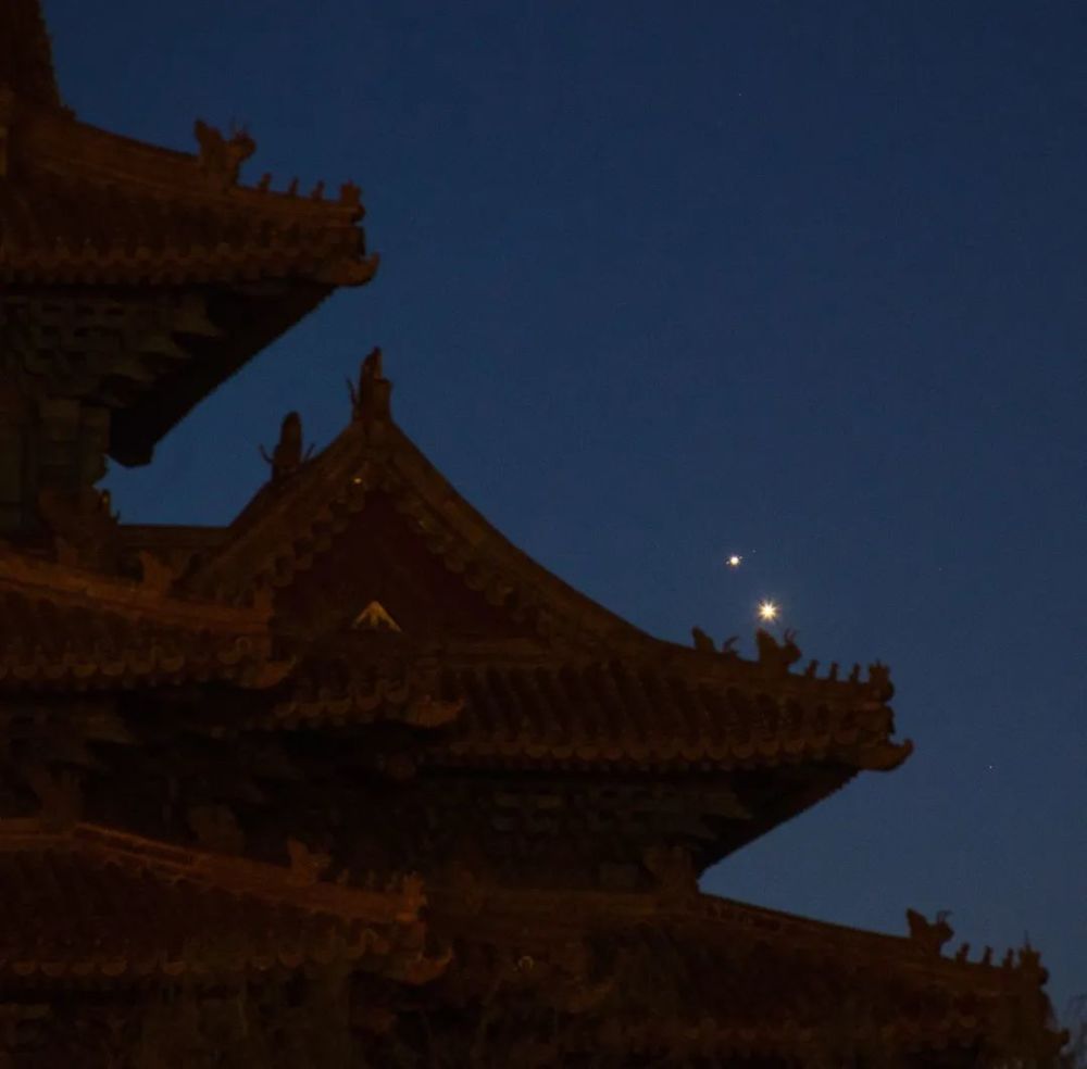 5月1日黎明,金星和木星携手从东方地平线升起,他们最近时角距仅有14′,而真正的金星和木星在宇宙中相距约7.8亿公里。
