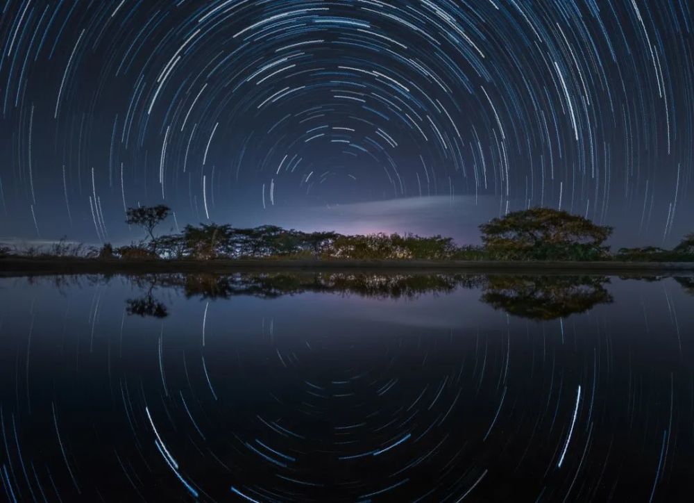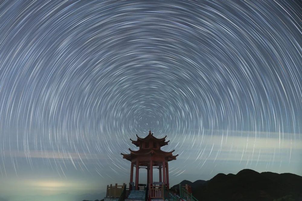 在广东信宜毛竹林场的山顶观景平台上,有一个亭子,眼看着北斗七星正指着塔尖上,我把它拍下了做成星轨。在中国,同心圆还含有美好的寓意,象征圆满、美满、以和为贵。