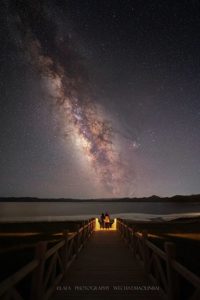 在2021年英仙座流星雨期间,我们驱车和乌云赛跑,寻找拍星地。一路都下着大雨,终于在到达青海后,才得以避开川西的坏天气。此时也正值七夕节前夕,我让我的朋友夫妻俩站在星空下,给他们拍下了这张合影。流星与银河,在时间维度上,是瞬间与永恒;宇宙与人,在空间维度上,是宏大与渺小。在星如雨坠的时刻直面宇宙,是否更能理解爱情的意义?