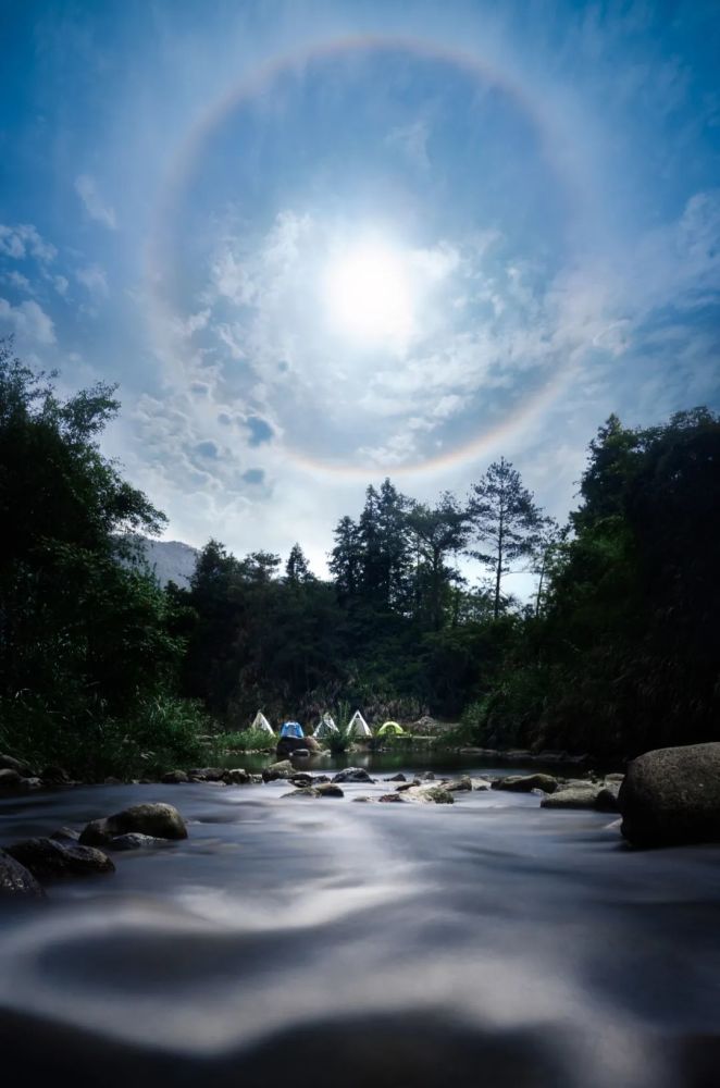 五一劳动节前夕,广州经历了疫情的考验,战胜疫情离不开每个人的坚持和努力。假期,我们五家好友相约来到人流稀少的古田村溪边露营。次日清晨,孩子们在溪水里快乐的玩耍,突然女儿说:爸爸,有彩虹!我抬头一看,太阳周围出现了美丽的日晕,占据了1/3的天空,十分震撼。相信我们终将战胜疫情,这山长水远的人世,我只愿你阅遍山河,觉得人间值得。
