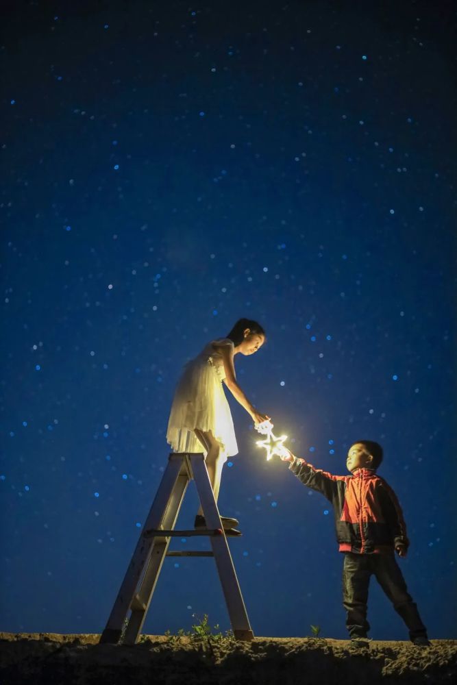 出发拍摄星空前,突发奇想带上一把梯子,尝试着看能不能拍摄一组孩子爬梯子摘星星的画面。片子出来后感觉还可以。让孩子们在夏天留下美好的回忆。