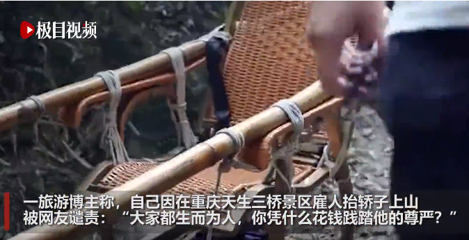 譬如,近期一旅游博主在网络上发视频,称自己因为在重庆武隆区天生三桥景区雇人抬轿子上山,之后遭遇网暴。有网友谴责他:“大家都生而为人,你凭什么花钱践踏他的尊严?”