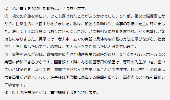 ある大学の福祉学部分野を志望する生徒の場合