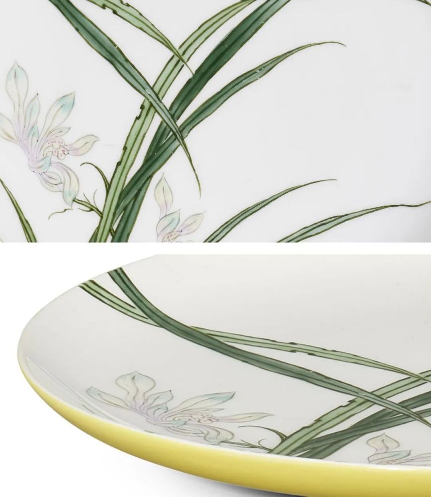 这只“康德四年”瓷盘,出于日本何处的名师大匠已渺不可考,也无法一一回溯,但其制作工艺精湛,气派端庄,达到甚至超过宣统御窑的水平,望之即知精工细作,绝非普通工匠所为。它的瓷盘胎土洁白细腻,胎土中含石英质成分较高,质坚而脆。烧制时用火大,温度高,瓷化程度亦高,扣之声音清越。白釉莹润若牛乳,釉彩与中国的釉彩有所区别,其色彩华丽,构图纤细,重视基本素描,花草图表现力丰富,画工精美,但构图显而易见其受中国文化的影响较深,同时在釉彩表现光彩明暗方面带有油画的风格,可见在上世纪三十年代初,日本瓷艺潜移默化继续受到中西方陶瓷艺术影响。