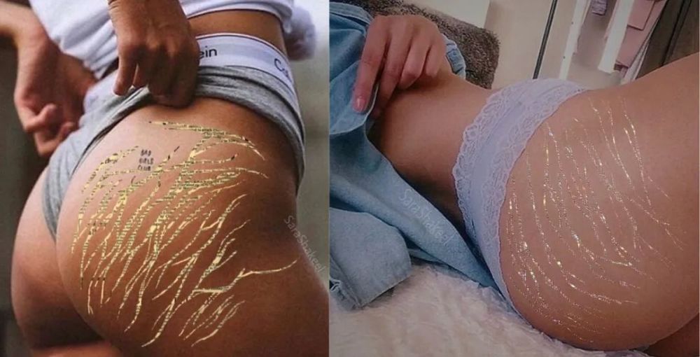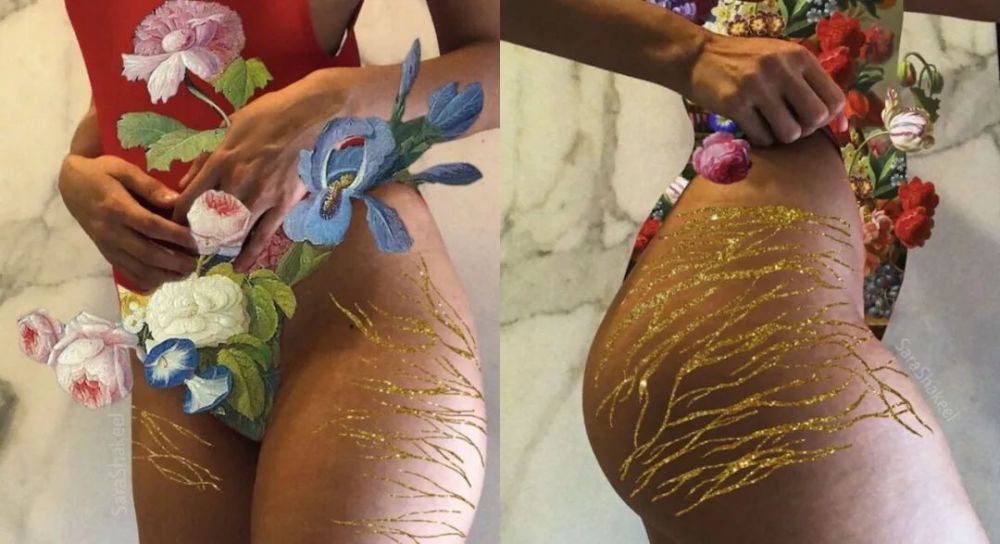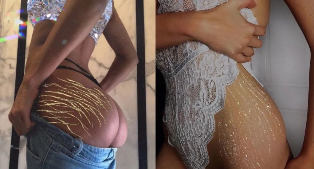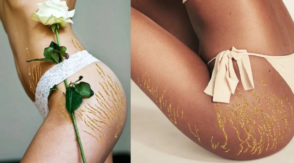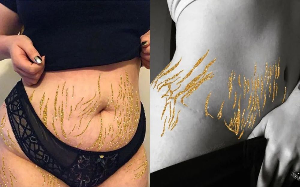 但Sara反而觉得这种身体自然的痕迹似乎有独特的美感,于是在朋友的妊娠纹上添上了金色亮片。