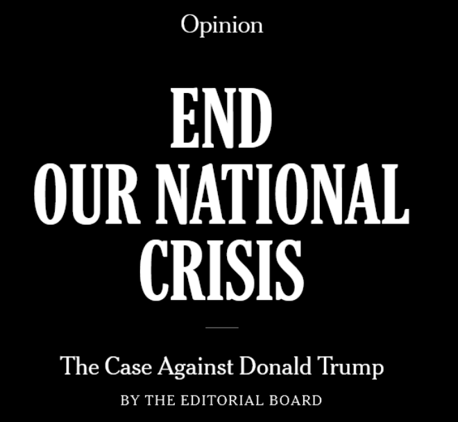 《纽约时报》这篇社论名为《结束我们国家的危机》,它称特朗普是“腐败、愤怒、混乱、无能、谎言、衰败。”